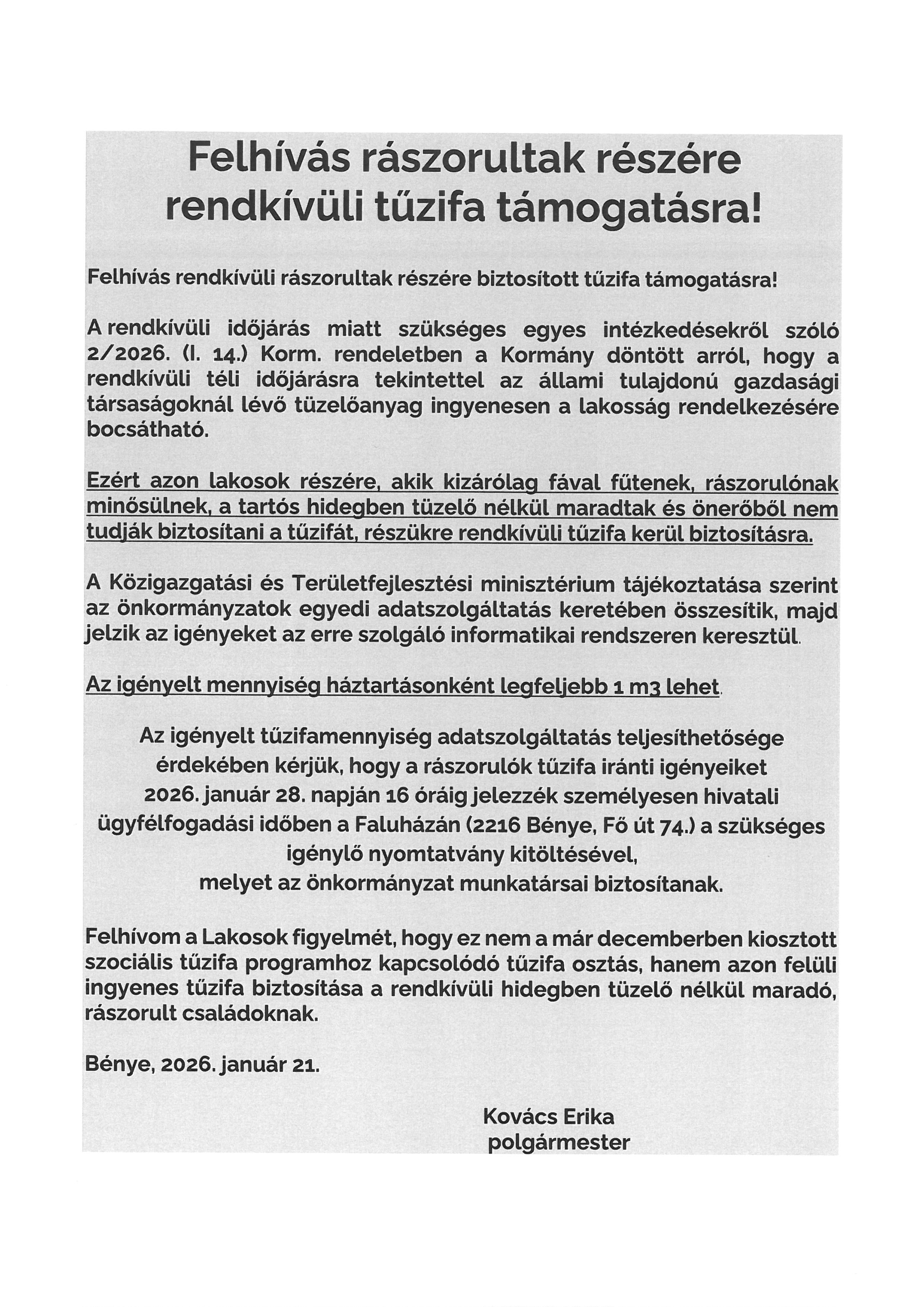 Felhívás rászorulók részére rendkívüli tűzifa támgoatásra